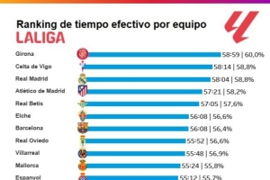 體育資訊3月3日訊 Opta統(tǒng)計(jì)了本賽季西甲各隊(duì)聯(lián)賽場(chǎng)均比賽凈時(shí)間,并列出榜單,赫羅納居首,皇馬第三、巴薩第七。