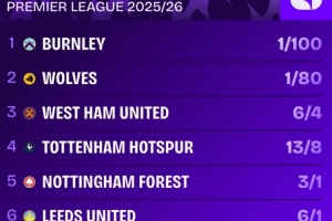 本賽季英超降級(jí)賠率排名:
